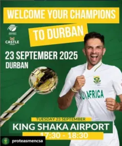 Durban is set to erupt in celebration this Tuesday, 23 September 2025, as the Proteas Men’s Cricket Team, touch down at King Shaka International Airport. Cricket fans from all corners of KwaZulu-Natal are invited to join what promises to be an unforgettable homecoming for a team that has not only made history, but done so with heart, passion and undeniable South African spirit.